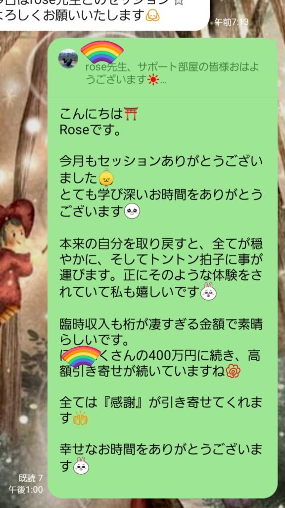 この3年の間に実に様々な事が有りましたが、その都度、私を信じて来てくれました。今では、幸せ過ぎる位で、パートナーシップも金銭面でもかなりの繁栄ぶりです。臨時収入が7桁超えであったとのご報告もセッションで受けました。
