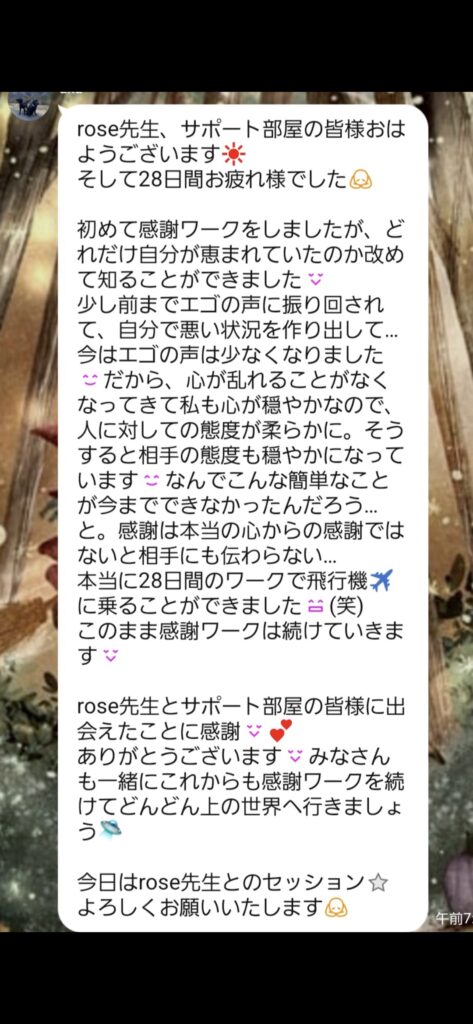 彼女は、今回『魔法のNOTEBOOK』宇宙プラン10月生としても一緒に感謝ワークを行っています。セッションを初めに受けてくれた3年前は、苦しくてもう前が見えない状態でした。