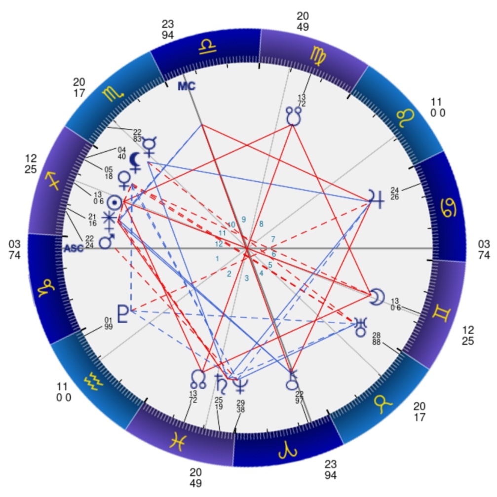 3ハウス海王星の合、11ハウス蠍座(大アルカナ死神)の水星、7ハウス蟹座の木星(R)と幸運の三角形であるグランドトラインを形成ですが、まず、これまでネイタルチャートに『幸運の三角形』を持っていてほとんど上手に活かしている人は見たことがありません。
