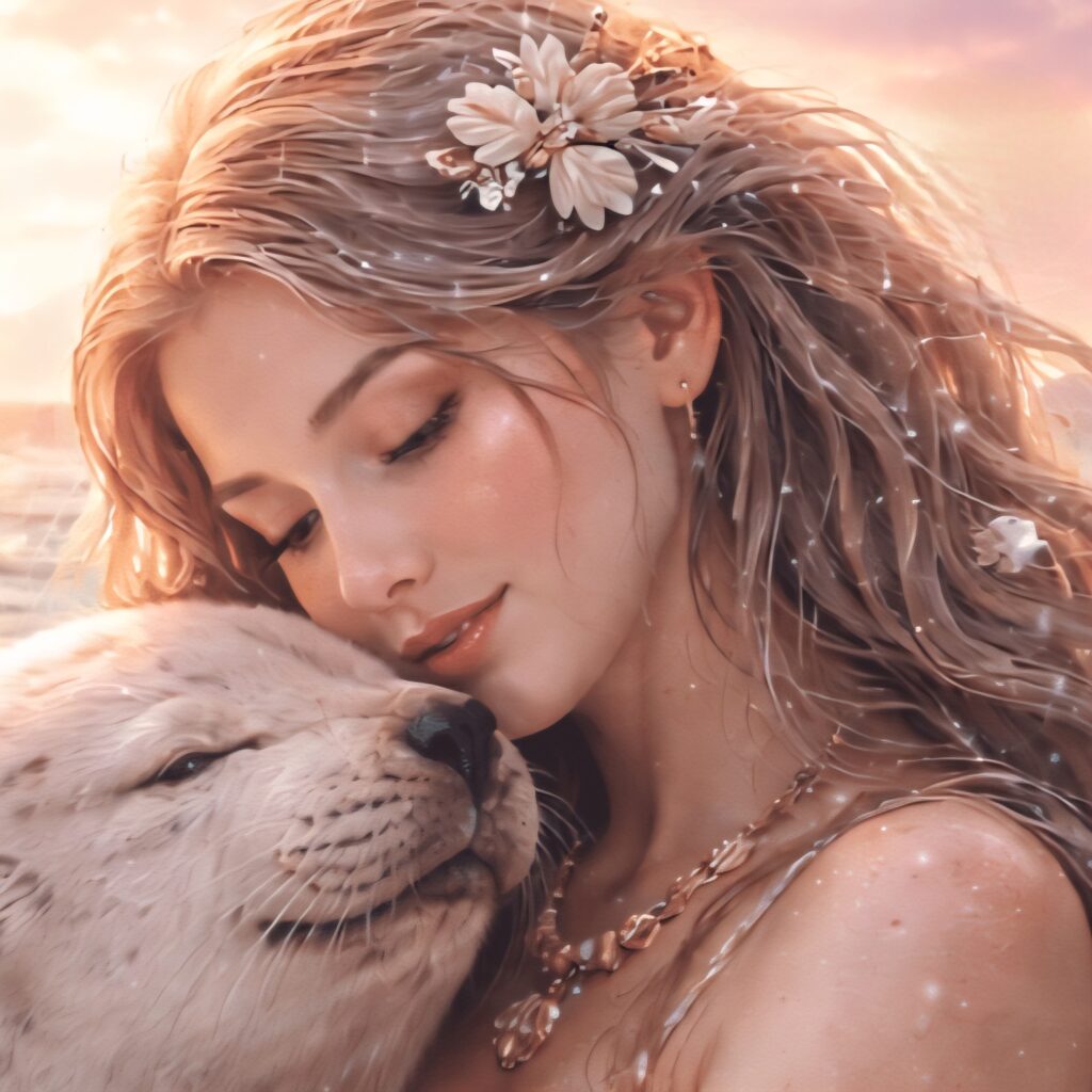 ✳️『女性が水から上がりアザラシも上がり彼女を抱く』
