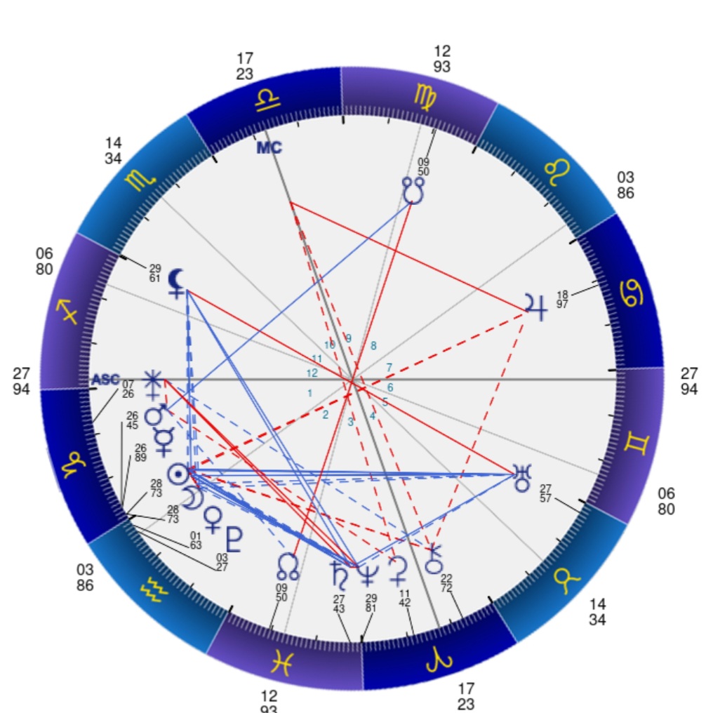また、1ハウス山羊座新月と3ハウス魚座の土星・海王星、5ハウス牡牛座の天王星が幸運の小三角形を形成。