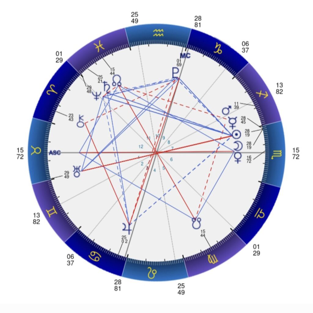 また、7ハウス新月(太陽と月)と1ハウス天王星、10ハウス冥王星、11ハウス土星・海王星で複合アスペクトのグレイドル《ゆりかご》を形成。調停が2つあり衝突している天体間を調停する働きがあります。