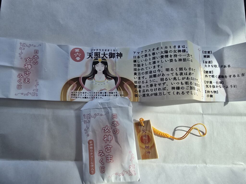 氏神様から御札を頂き、女神おみくじをひいたら『天照大御神様』でした。
