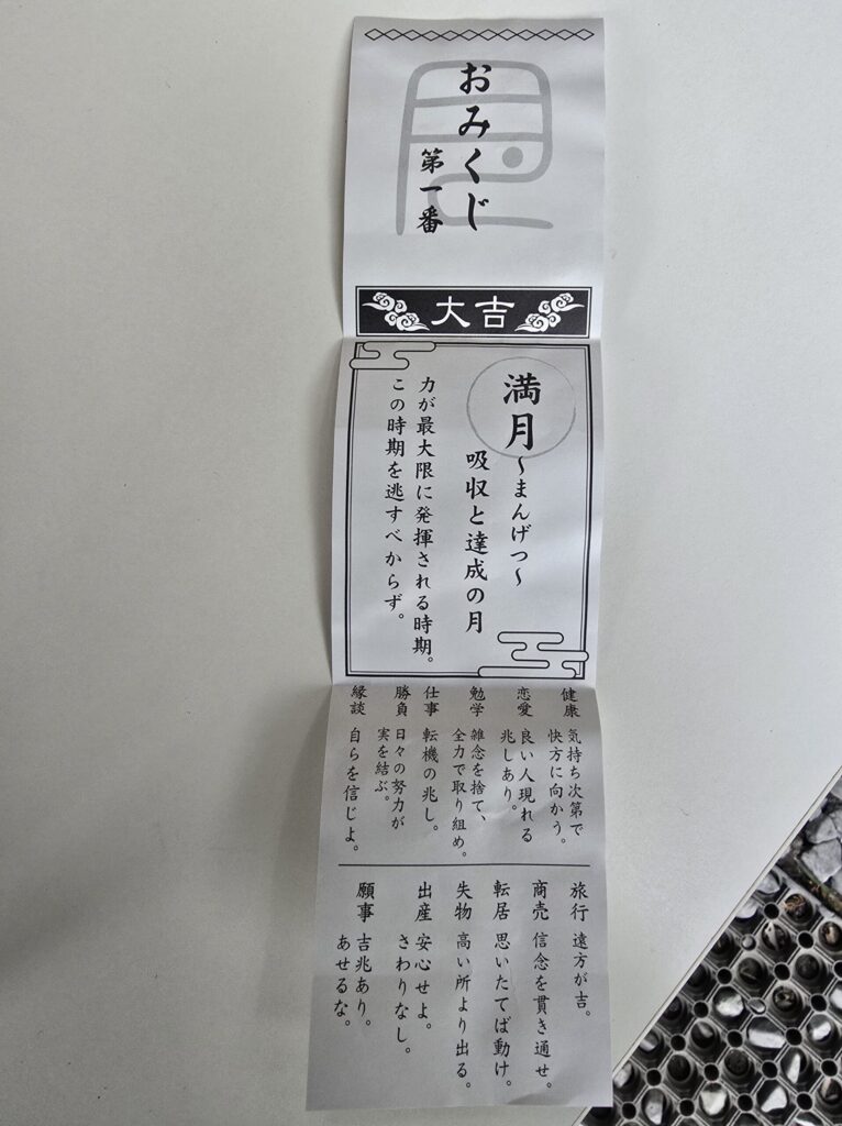 おみくじを引いたら『大吉』満月~吸収と達成の月~。おみくじの番号はなんと『一番』。1月11日であり、弊社5年目の始まりの日であり(1)ます。