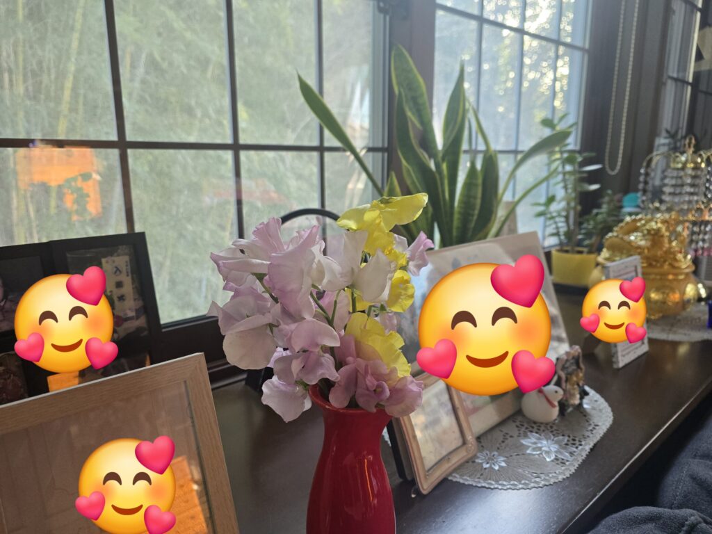 母を見送りながら玄関の花に水やりをしていました。