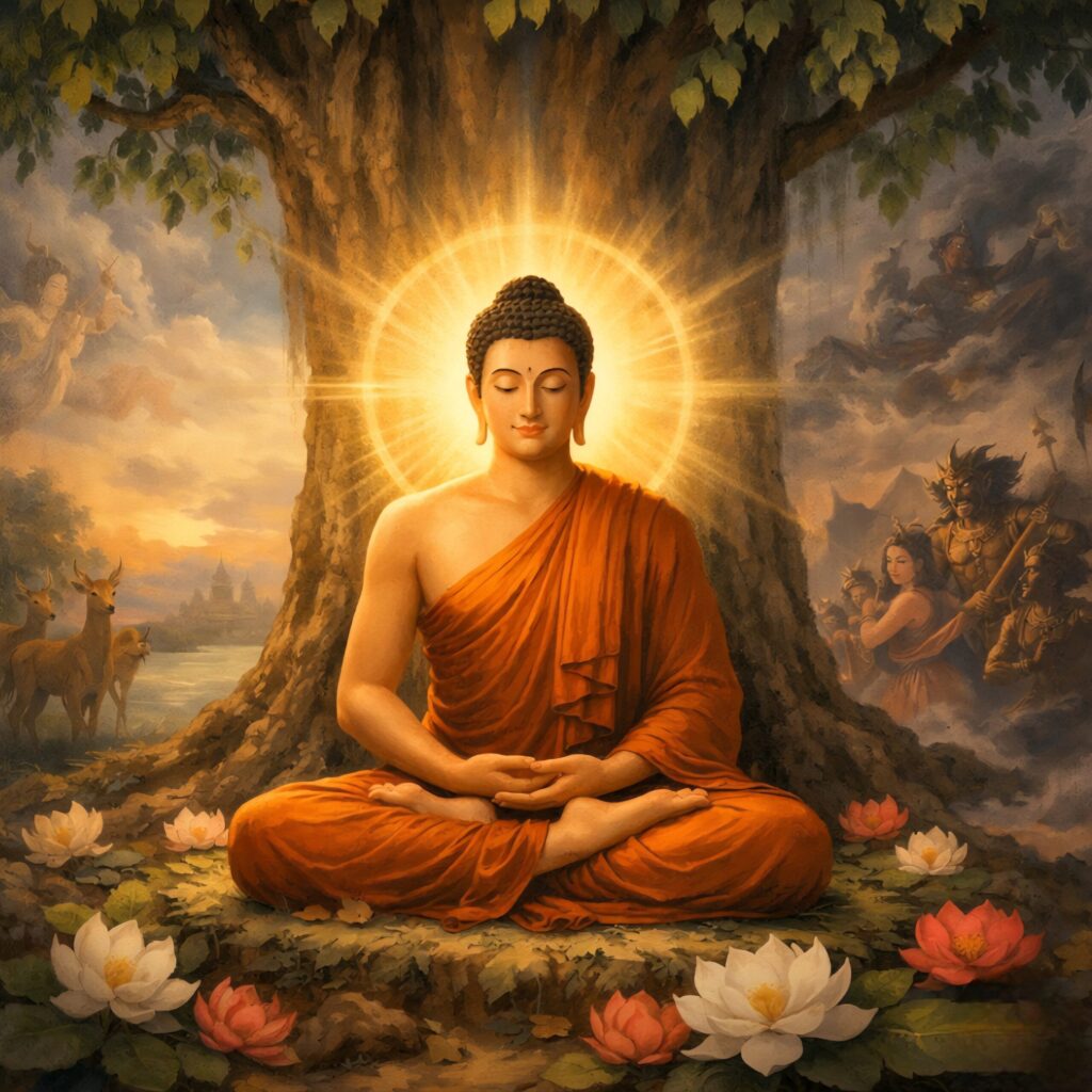 そして、菩提樹の下で深い瞑想に入り、ついに悟りを開きます。